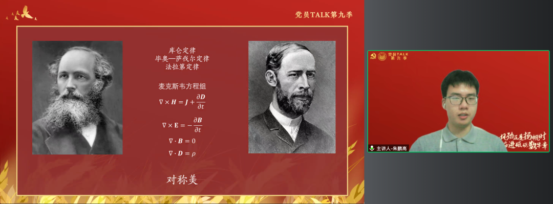2018级本科生党员朱鹏高同学,便从国之重器讲起。人们对时空的不懈探索,从伽利略研究单摆运动到量子方程原子钟,这是几代几十代人类智慧的结晶,才成就了今天中国的乃至世界的北斗。除了天上的北斗,还有海里的港珠澳大桥,这些国之重器都离不开数学的力量。