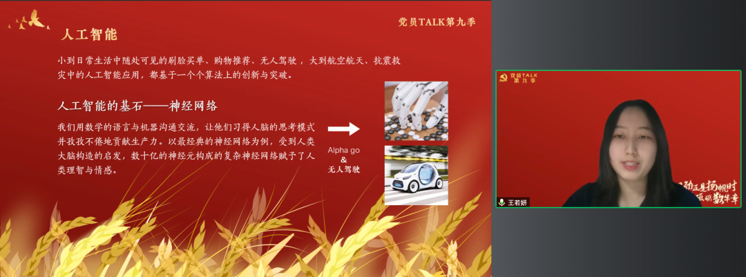 来自本科生党支部的王若妍同学,向我们介绍了数字货币诞生流通背后的数学原理,足见数学的基石作用,并且指出了数字货币对于国家发展的重要意义。数字经济事关国家发展大局,立于中华民族伟大复兴战略全局和百年未有大变局,数学不仅是数字经济的基础,未来也必然会在更多方面被广泛应用。同济数学青年更应该以数学强国为己任,用数学知识助力各前沿领域进步发展。在数字经济迅猛发展的当下,同济数学人必将在各行业的数字化转型之路上大放异彩。