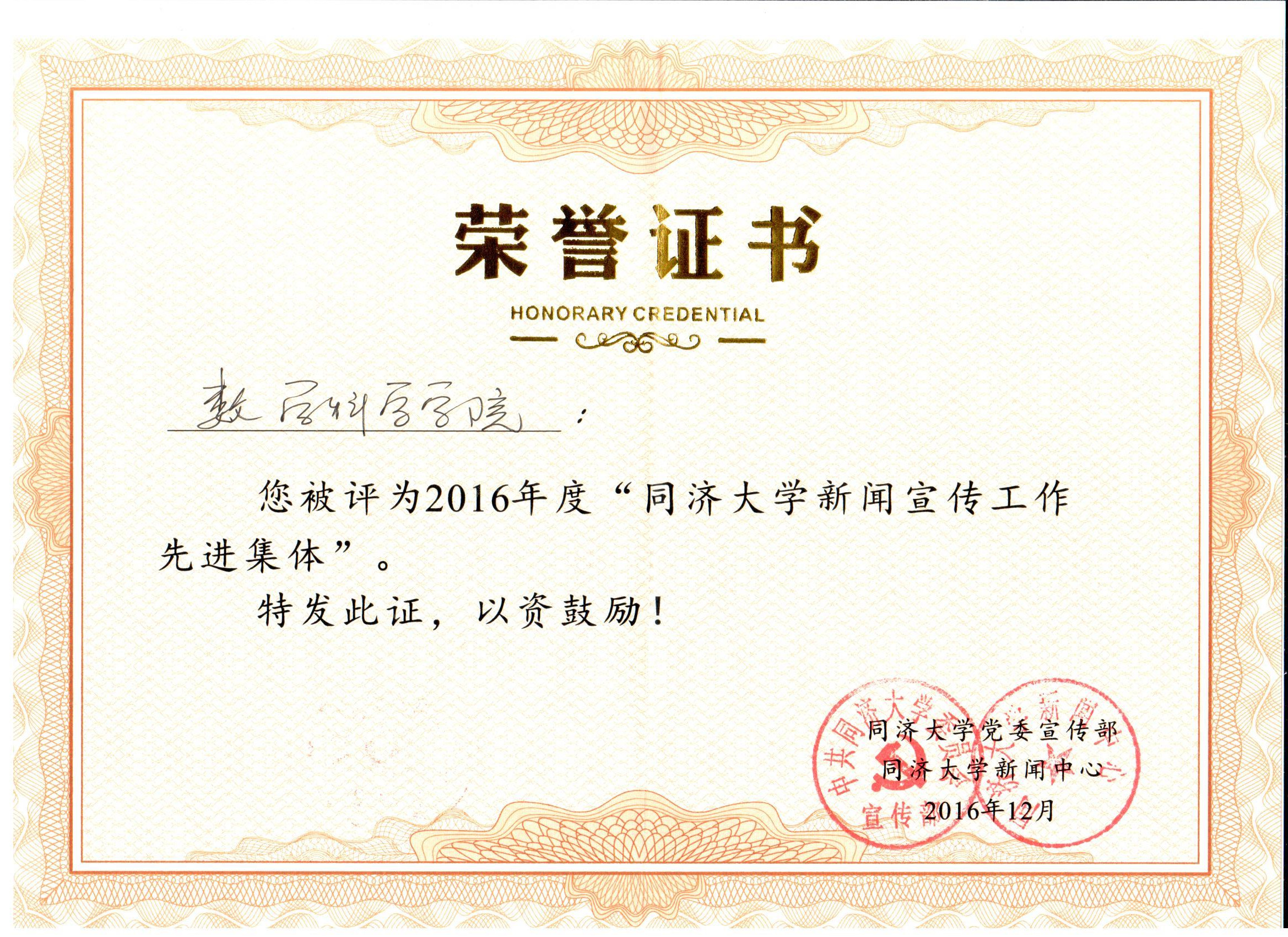 年度新闻宣传先进集体的评选是依据各个单位投稿并发布到学校官方网站上的数量及质量、各院系官方网站运营情况以及新媒体平台建设和影响力等开展评比工作。新葡的京集团35222vip一直以来强调和重视宣传工作,扎实做好学院学科建设、人才培养、学术交流等各方面突出工作的新闻报道;近年来在新媒体平台的建设与运营方面也卓有成效,2012年率先申请并注册了院级微信公众号平台——“同济数学青年”,历经4年的运作和积累,已经收获粉丝量逾三千人,为新葡的京师生人数的七倍,头条阅读量长期过百,单条推送最高阅读量过一万三千余次,位居校内院系同类微信平台前列。“同济数学青年”还于今年获得了“2016年度新葡的京集团35222vip共青团优秀微信公众号人气奖”。