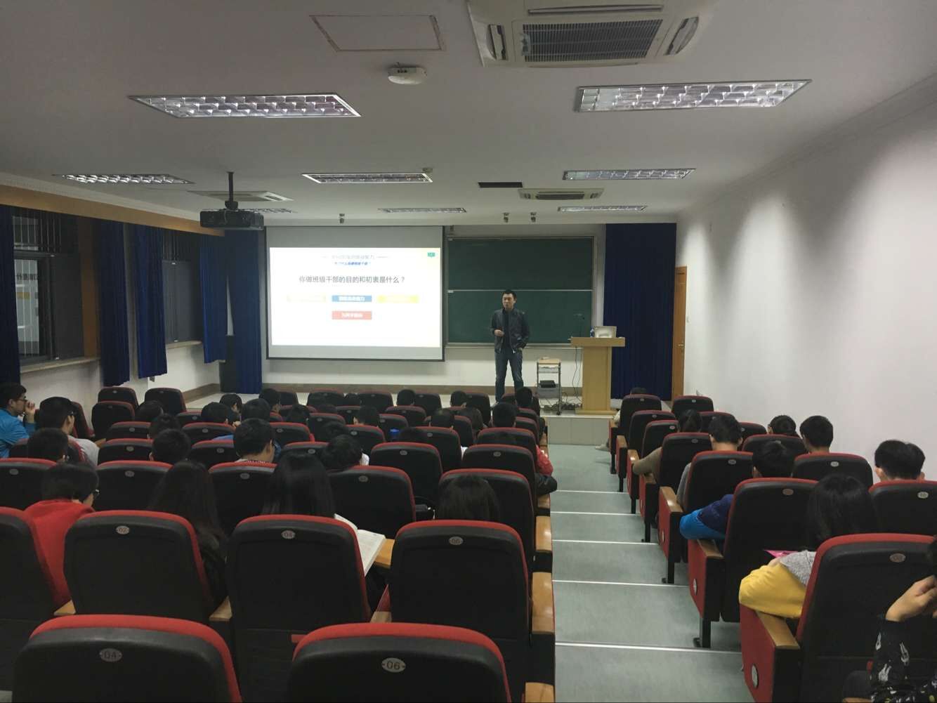 张老师分别从“为了什么而做班干部”、“班级干部的自我定位”、“班级管理技巧”和“班级干部的收获”四个方面展开了介绍。他结合自身经验,分析了每个班级都有的几种类型的同学,强调班级是一个集体:“班干部叫干部而不能以干部自居”、“班长不能把所有事情都一个人抗,要发挥集体的力量”。除此之外,张老师也给出了一些班级管理方面的详细而切实的建议。他指出,班级活动的开展应该有一个规范的流程:与班主任协商策划、核心团队达成共识、在可控范围内听取意见、分工合作共同完成、及时总结调整。其中核心团队发挥着重要的作用,他们使同学们更加团结,能够达成统一意见。要使活动成功举办,与同学们的沟通必不可少。班干部在与同学们沟通的过程中应该掌握说话的艺术而不是简单的复制粘贴,要通过班级群里发通知、逐个寝室通知等方式确保每一名同学都接到了通知。