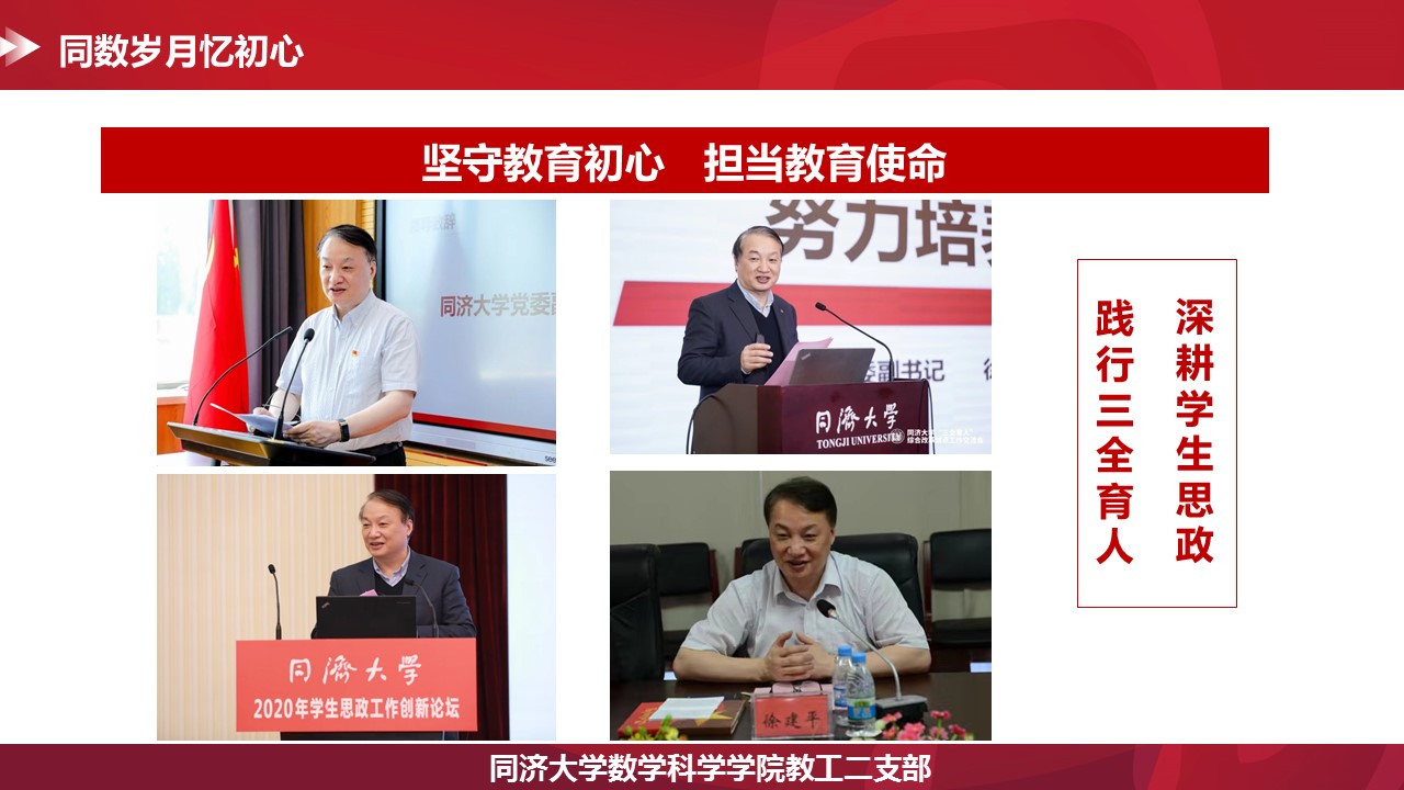 近日,学院教工二支部积极开展年度对标争先项目——“同数岁月忆初心”主题系列学习交流活动。邀请多名优秀老党员老师在支部分享他们在新葡的京集团35222vip的奋斗故事,支部党员在“忆初心”的讲述中汲取同济数学精神力量。