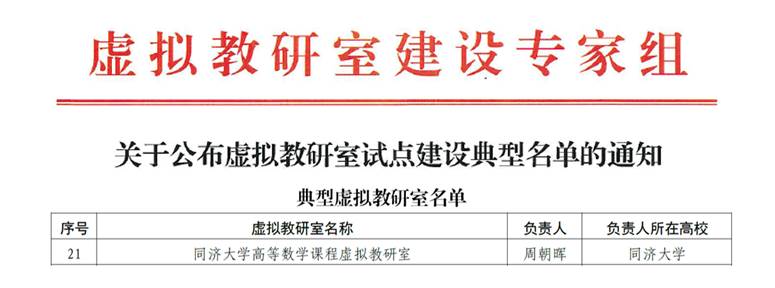 近日,教育部虚拟教研室建设专家组公布了虚拟教研室试点建设典型名单,共评选出典型虚拟教研室50个(其中数学类2个)、典型教研方法100项、典型教研成果50项。新葡的京新葡的京集团35222vip周朝晖教授牵头建设的“新葡的京集团35222vip高等数学课程虚拟教研室”入选典型虚拟教研室。