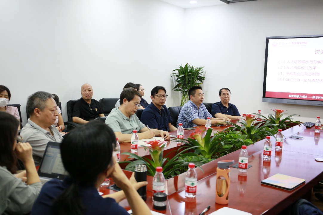 与会老师围绕人才培养理念、人才培养模式、学科专业建设,结合自身的教学、科研经验展开热烈的讨论和交流,就教学管理、大类培养、课程设置、课程考核、学生实习、教师专业发展、学科人才队伍建设等角度发表了意见,提出了建议。鉴于数学学科的特殊性,部分老师建议学校应在招生、人才培养上赋予学院更多的自主权,为数学人才培养提供良好的生源基础;在数学强基人才的培养上,专业学院和交叉学院应针对如何进行强基人才培养进行探讨和论证,确保在教学内容、技术手段等方面能够充分保障交叉培养模式的开展。