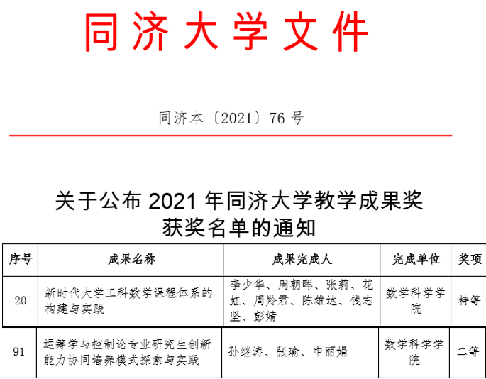 课程思政建设创新发展的同时,教学研究与改革也取得突出成绩。李少华团队“新时代大学工科数学课程体系的构建与实践”获得2021年新葡的京集团35222vip教学成果奖特等奖,孙继涛团队的“运筹学与控制论专业研究生创新能力协同培养模式探索与实践”获评二等奖。