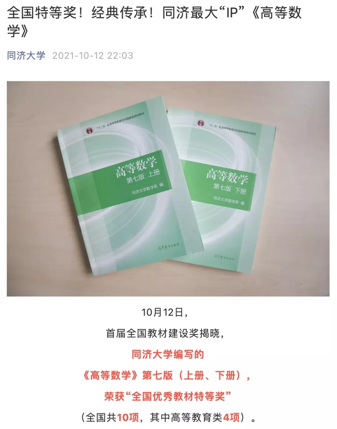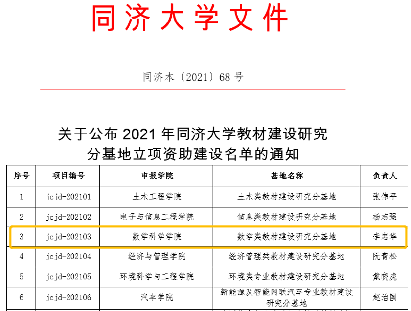 高校教材建设是高等教育内涵式发展的重要抓手,学院继续传承和发扬樊映川编写《高等数学讲义》经典教材的科学精神,严格教材编写和选用工作的高标准、严要求,努力打造有中国特色、同济烙印的教材体系。2021年度新葡的京集团35222vip数学系编《高等数学》第七版获得首届全国教材建设奖全国优秀教材(高等教育类)特等奖,全国仅四套教材获此殊荣。