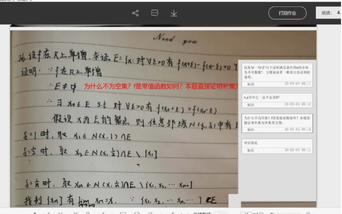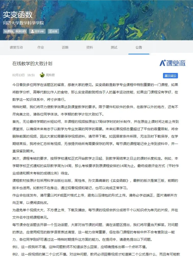 《实变函数》是数学专业课程中非常重要的一门课程,对学生的数学素养至关重要,在疫情特殊时期,我选择了课堂派作为教学工具,尽力使教学效果达到课堂教学的要求。按照课程要求,制定了详实的教学计划,选择合适的教材,录制相应课程,同时,通过课堂派线上互动的工具,与同学们及时交流,答疑解惑。学习是一个自主自觉的过程,同学们要善用网络课程的优势所在,自觉学习,主动学习。