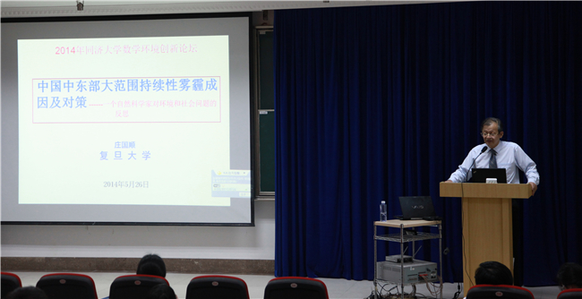 2014年5月26日,由新葡的京集团35222vip数学系主办、环境科学与工程学院协办的新葡的京集团35222vip数学环境创新论坛在四平路校区致远楼成功举办,论坛围绕主题“邂逅跨学科交流的魅力,创造数学与环境的精彩”,邀请复旦大学大气化学研究中心主任庄国顺教授做大会报告。数学系党委书记李少华教授、数学系党委副书记李静茹老师、数学系博士生导师徐承龙教授、环境科学与工程学院李卓老师出席本次活动,来自数学系、环境科学与工程学院以及化学系的近百名师生参加了论坛。