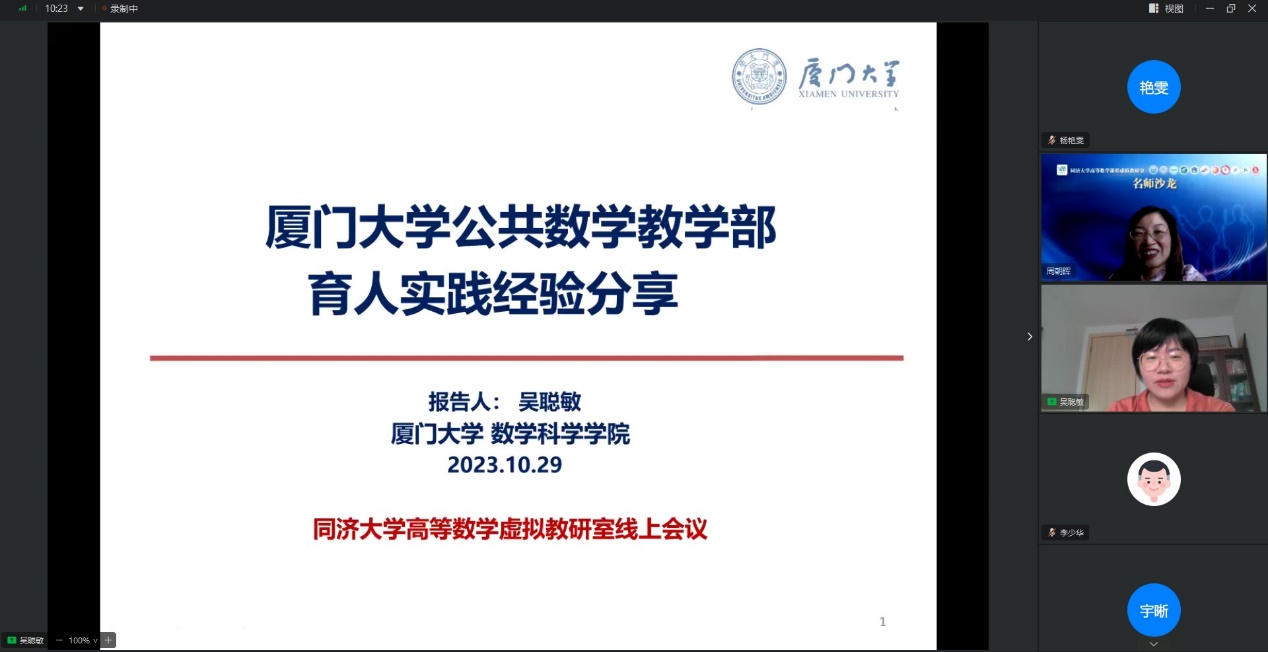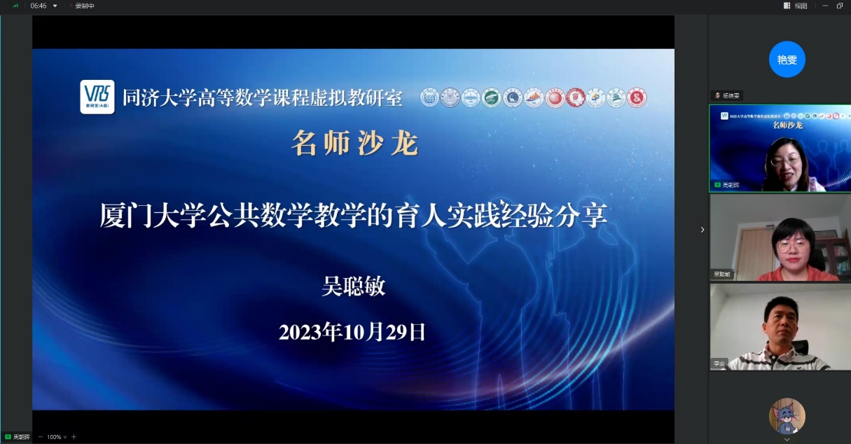 10月29日下午,新葡的京集团35222vip高等数学课程虚拟教研室成功举办了第六期“名师沙龙”活动。本期“名师沙龙”活动邀请厦门大学新葡的京集团35222vip公共教学部副主任吴聪敏副教授做主题报告,报告题目为“厦门大学公共数学教学的育人实践经验分享”。本次教研活动通过虚拟教研室平台在线开展,由教研室负责人周朝晖教授主持,新葡的京集团35222vip副院长李忠华教授发表致辞,虚拟教研室成员以及来自全国多所高校的大学数学课程建设负责人、骨干教师等参与了会议。