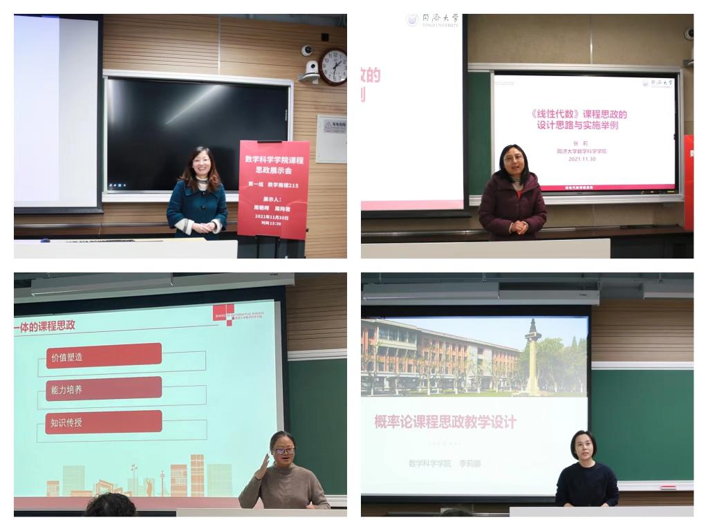 周朝晖老师展示了贯穿思政元素的高等数学教学课堂,周羚君老师介绍了如何在课堂上激发学生对数学学习的热爱,并列举教学片段加以说明;张莉、李莉娜老师作为线性代数和概率论课程的骨干教师,介绍了两门课程的课程思政建设如何进行设计与实施,周海港老师介绍如何引导学生加强数学学习,突破学习的障碍,避免学习的误区,杨筱菡老师以概率统计课程为例,分享了数学专业课上可复制、可推广的课程思政教学方法。老师们立足于数学学科特点,从教学目标、教学设计、教学方法、教学内容等方面着手,深入挖掘数学专业课程中蕴含的思政元素,精准提炼育人切入点,将专业教学与思政教育有机融合,实现了知识传授与价值引领相统一、显性教育和隐性教育相统一、教书与育人相统一。