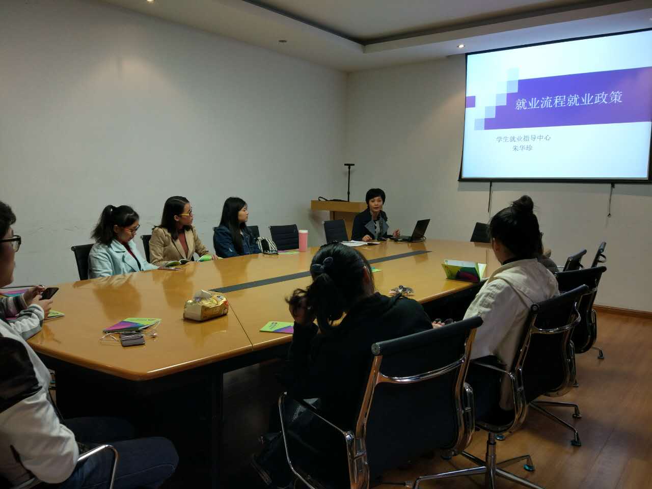 11月15日中午,新葡的京集团35222vip2016年度就业指导及宣讲会在致远楼102举行,就业指导中心朱华珍老师应邀对当前就业形势、就业政策以及就业流程进行了详细的讲解,并与参会的二、三年级学生进行了交流和指导。